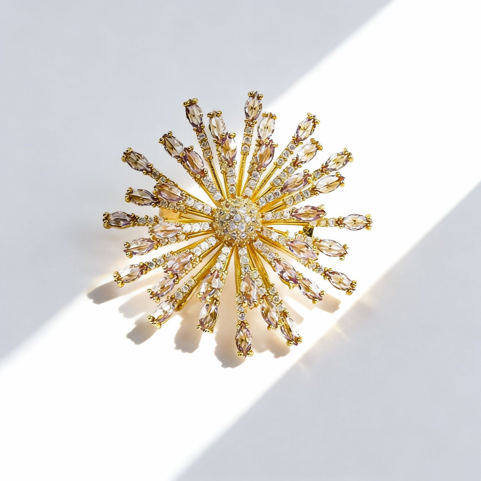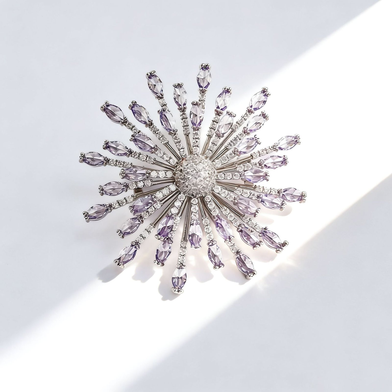 Inspired by the dazzling firework bursts in the night sky, this crystal brooch is a perfect fusion of elegance and glamour. Each radiating “petal” is adorned with translucent lavender marquise-cut crystals, while the center is densely set with tiny sparkling stones. As light dances across it, layers of halo glow are refracted, as if capturing a piece of the starry sky and pinning it to your lapel.